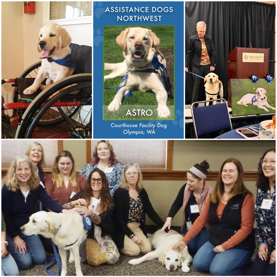 Astro was the first Courthouse Dog placed in the Pacific Northwest and has been a trailblazer for many more. Thanks to Astro and his partner, Dr. Tambra Donohue, our Courthouse Dog Program has grown over the past 10 years. We now have 15 Courthouse Dogs working throughout Washington, Oregon, and Idaho. During his long career, Astro helped thousands of children who are victims of crime, to find their voice through the legal process. Tambra is the Director of the Monarch Children's Justice Center in Olympia, WA and shares, "Astro is so special to this community. Thousands of people have been touched by him. He has transformed my work and my life. We are so grateful to Assistance Dogs Northwest for bringing him to us."